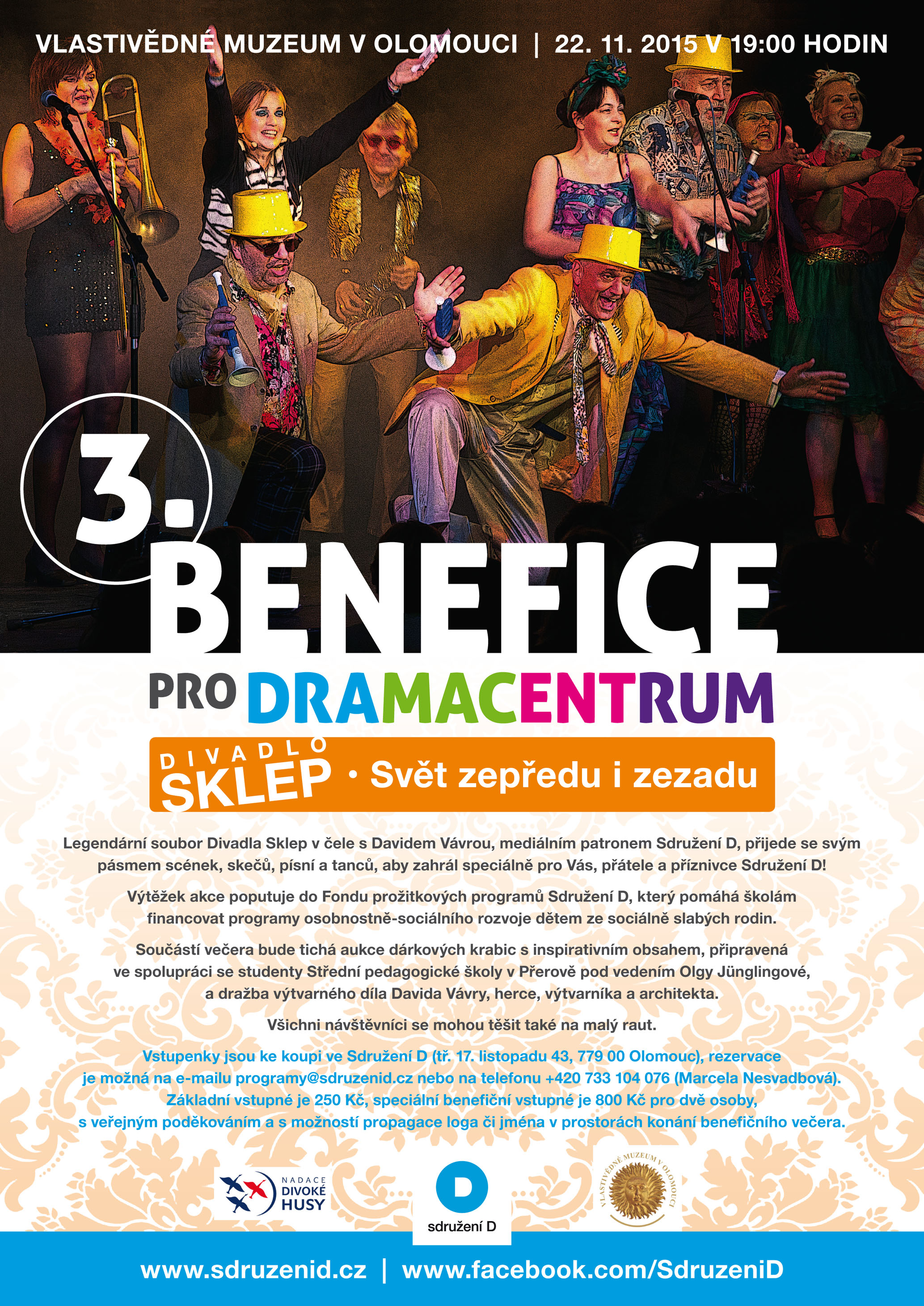 Výtěžek akce poputuje do Fondu prožitkových programů Sdružení D, který pomáhá školám financovat programy osobnostně-sociálního rozvoje dětem ze sociálně slabých rodin. Vstupenky jsou ke koupi ve Sdružení D (tř. 17. listopadu 43, 779 00 Olomouc), rezervace je možná na e-mailu programy@sdruzenid.cz.