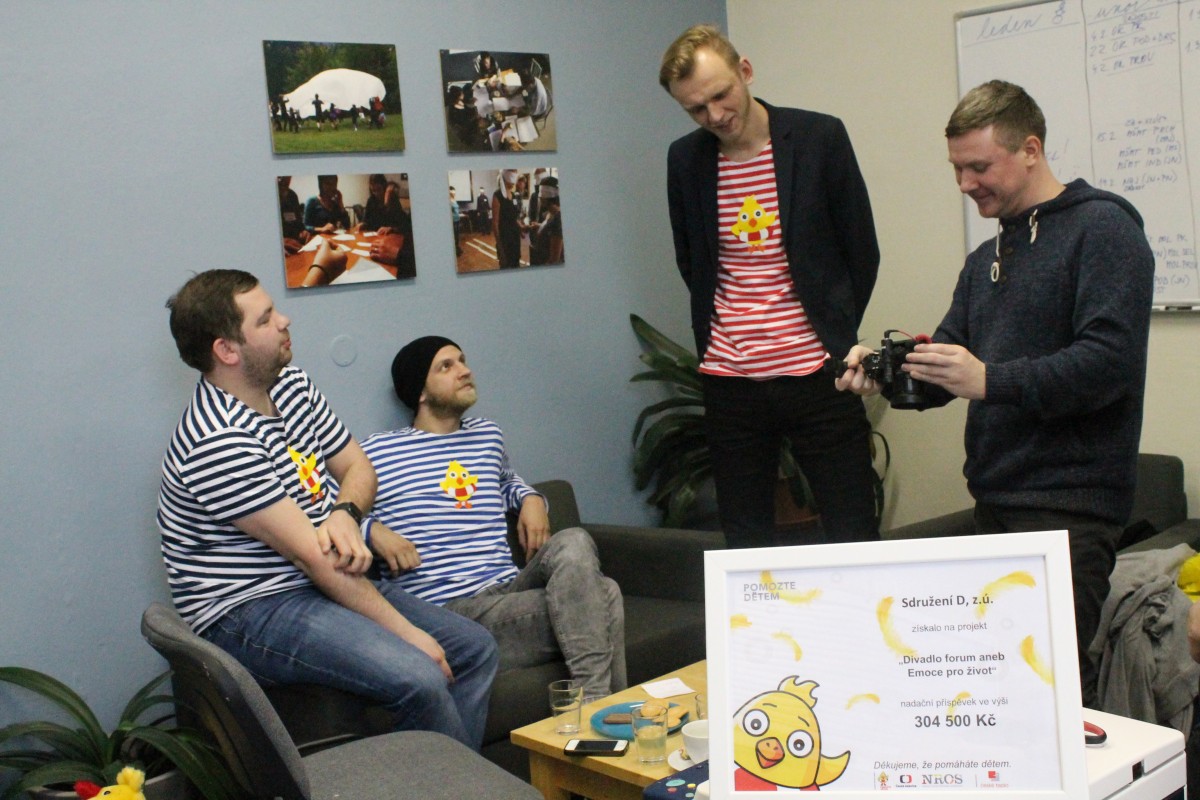 Žijeme naplno, žijeme s emocemi! Náš projekt podpořený Nadací rozvoje občanské společnosti „Emoce pro život“ je v plném proudu. Jsme velmi potěšeni, že Divadlo fórum poctili svou návštěvou zástupci charitativní sbírky Pomozte dětem a nepřijeli sami. Vidět na vlastní oči jak „učíme prožitkem“ měli i kluci z kapely O5aRadeček. Spolu se 7.B. z olomoucké ZŠ Nedvědova jsme společně prožili dopoledne plné emocí zaměřené na prevenci kyberšikany. Hledali jsme účinná řešení, jak se zachovat v nesnadných situacích, které nás potkávají. Děti hrály spolu s námi naplno! Nálada byla skvělá! Děkujeme účastníkům, všem aktérům i milé návštěvě za sympatickou spoluúčast a zájem. Těšíme se na výsledek letošní sbírky Pomozte dětem a jsme rádi, že naše společné Emoce pro dobrý život skutečně pomáhají.
