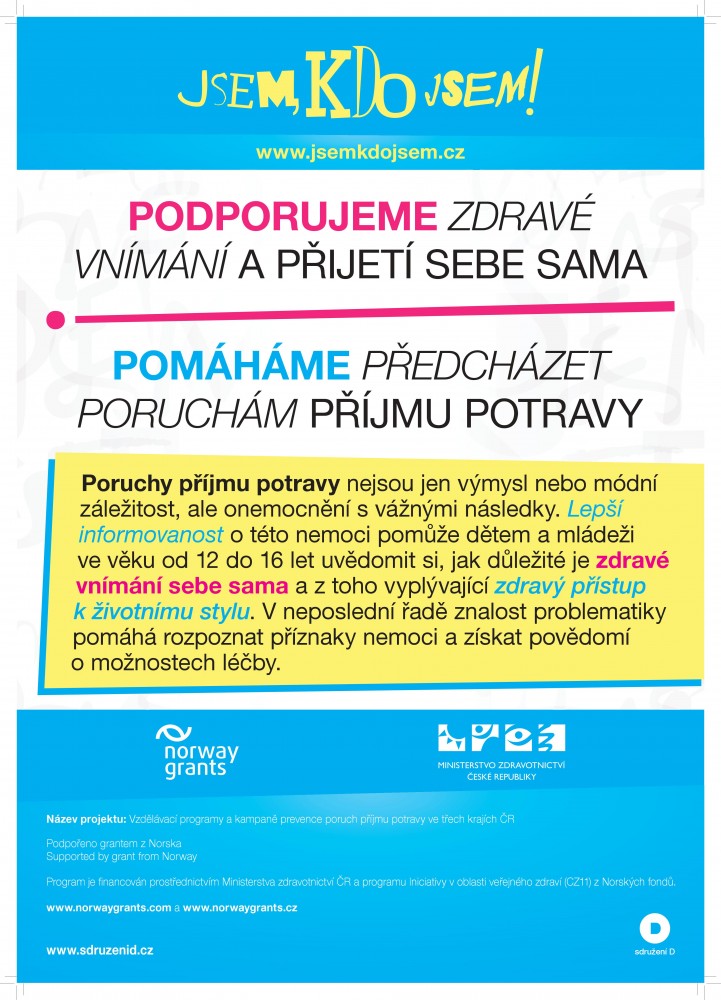 S podporou Ministerstva zdravotnictví a Norských fondů od května 2015 do konce dubna 2017 probíhal náš projekt Vzdělávací programy a kampaně prevence poruch příjmu potravy ve 3 krajích ČR. Program na prevenci zdravotních problémů v dětském věku měl za cíl předcházet poškozování vlastního zdraví. Tematicky čerpal z příběhů nezdravé touhy po štíhlosti a přijímání falešných vzorů. Edukační část programu se zaměřila na způsoby rozpoznání příznaků a vyhledání pomoci, pomáhala dětem v bezpečné rovině pochopit rizika spojená s poruchami příjmu potravy a učila jim předcházet.